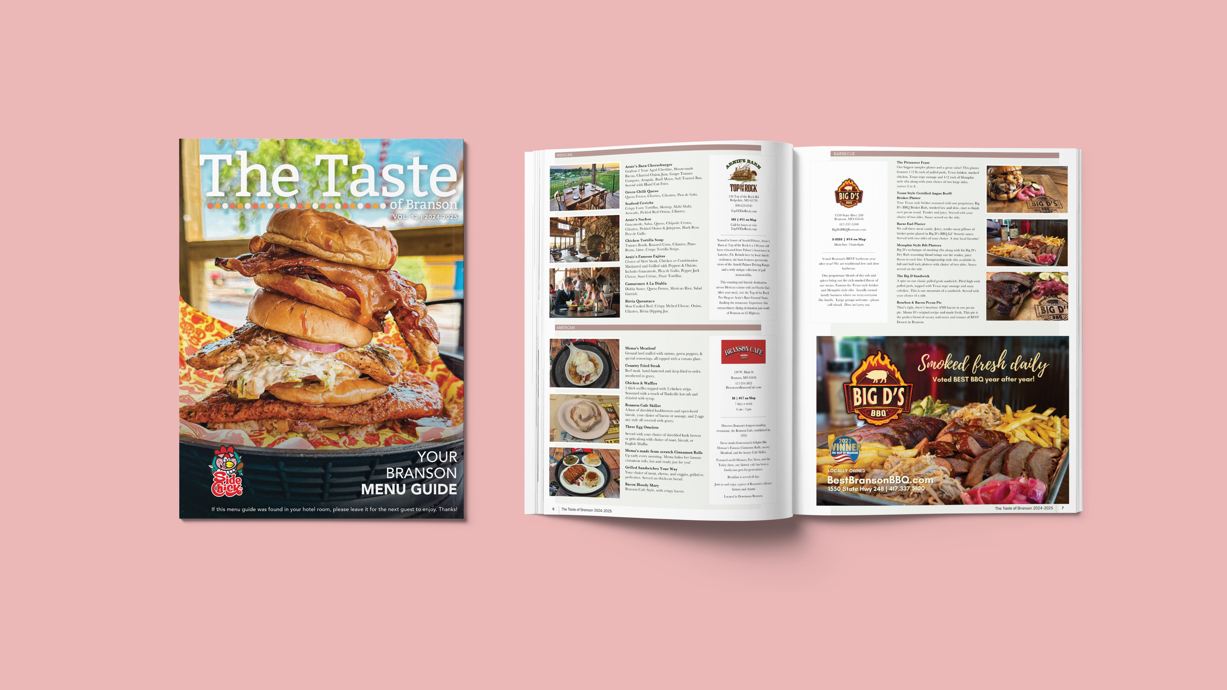Branson is a vibrant hub of tourism, offering visitors a wide array of attractions, from live shows and unique shopping experiences to diverse restaurants and thrilling activities. At Myer Hospitality, we provide advertising opportunities tailored to local businesses, helping them connect with tourists and locals through our curated publications. These materials serve as essential guides, inspiring readers to explore and experience everything Branson has to offer.As the sole Graphic Designer at Myer Hospitality, I modernized and elevated the design of these publications to captivate audiences and enhance their engagement. By creating visually appealing layouts and cohesive branding, I ensure our magazines effectively highlight the best of Branson, fostering connections between local businesses and their audiences.